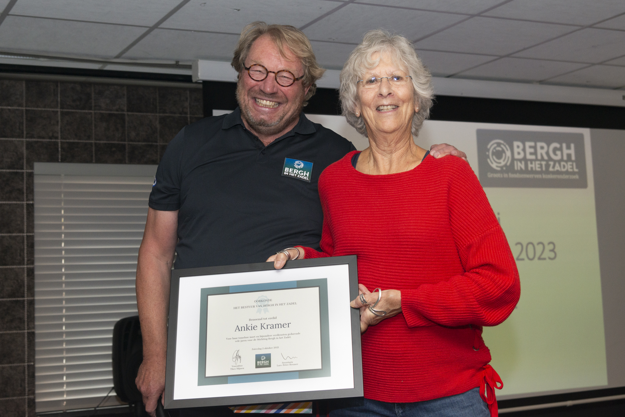 Ankie Kramer, oud-secretaris en 'moeder van het peloton' werd in het zonnetje gezet.